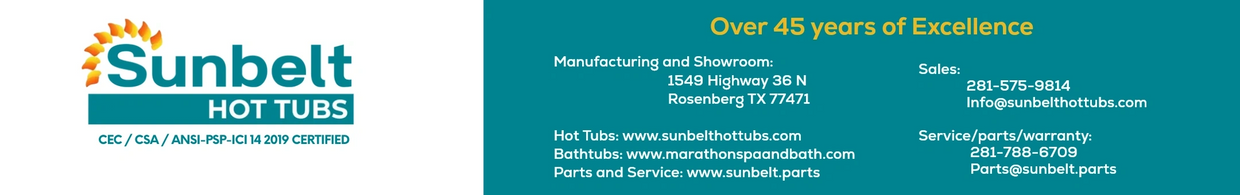 Sales: info@sunbelthottubs.com - Parts/Warranty: 281-788-6709 or info@sunbelt.parts